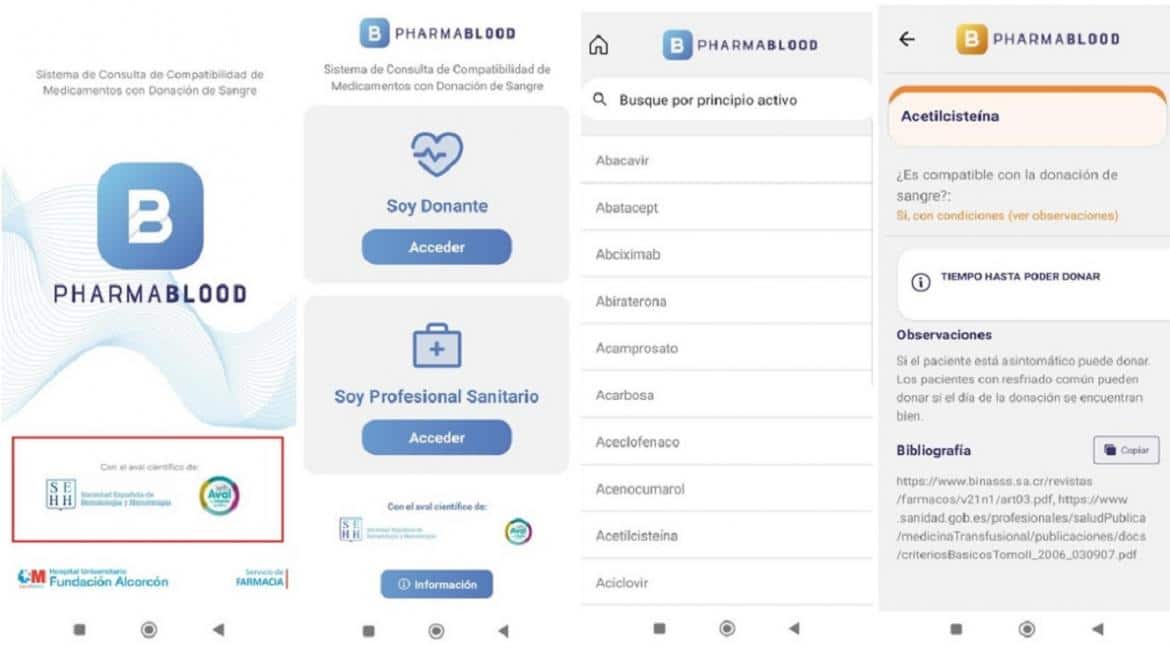 Disponible gratuitamente en sistemas Android e iOS, Pharmablood® incluye una doble interfaz; una para profesionales sanitarios y otra para donantes. Su sistema de búsqueda abarca cerca de 900 principios activos, desde los más comunes hasta los más específicos. Además, incorpora un sistema de «semáforo» que indica la compatibilidad de los fármacos con las donaciones: verde para sin restricciones, rojo para incompatibilidad, y tonos intermedios para otras situaciones.